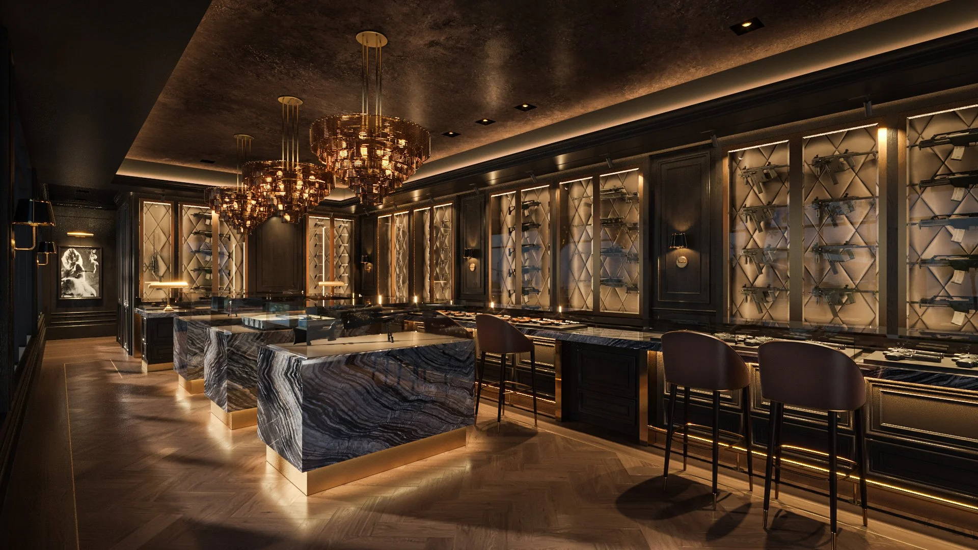 This is a space where high-performance engineering meets the atmosphere of a private members' club. This showroom redefines the traditional armory, transforming it into a bespoke gallery designed for the most discerning collectors. A masterclass in "dark academia" crossed with modern executive design. It trades utilitarian steel for a rich, immersive environment that emphasizes the artistry of the machinery on display.