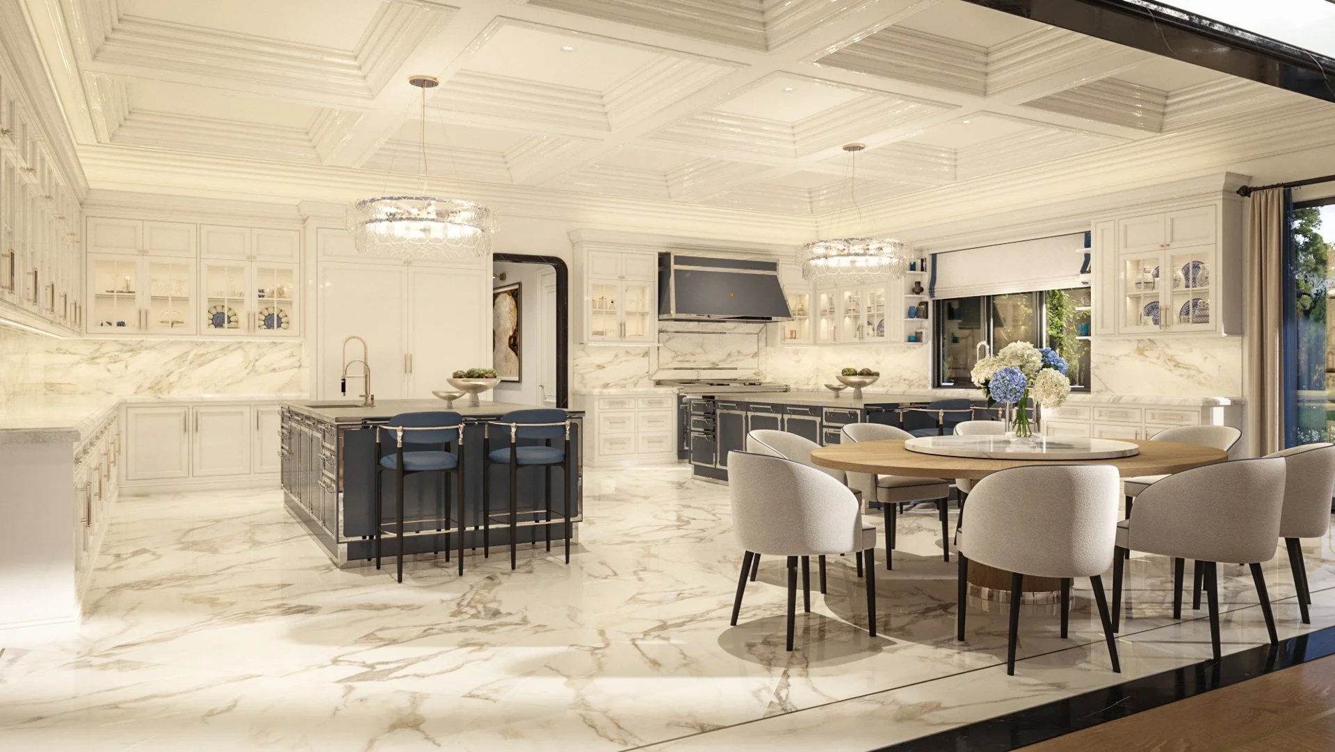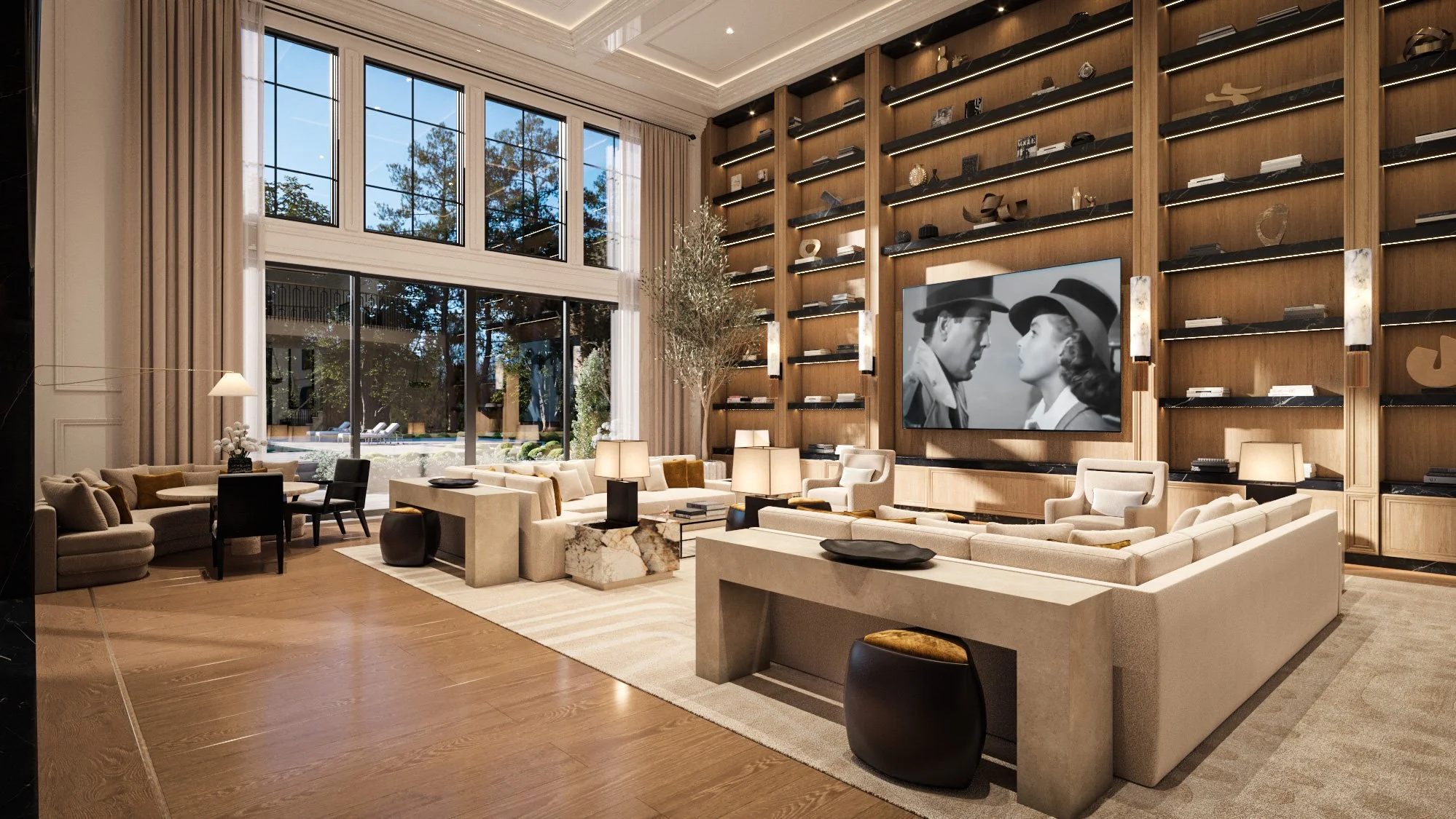 The residence utilizes a dramatic interplay of light and reflection, featuring soaring ceilings and custom glasswork that create an atmosphere of boundless space. From the luminous glow of rare, backlit stone to the precision of bespoke cabinetry and metallic accents, the material palette is selected for both its tactile beauty and visual impact.