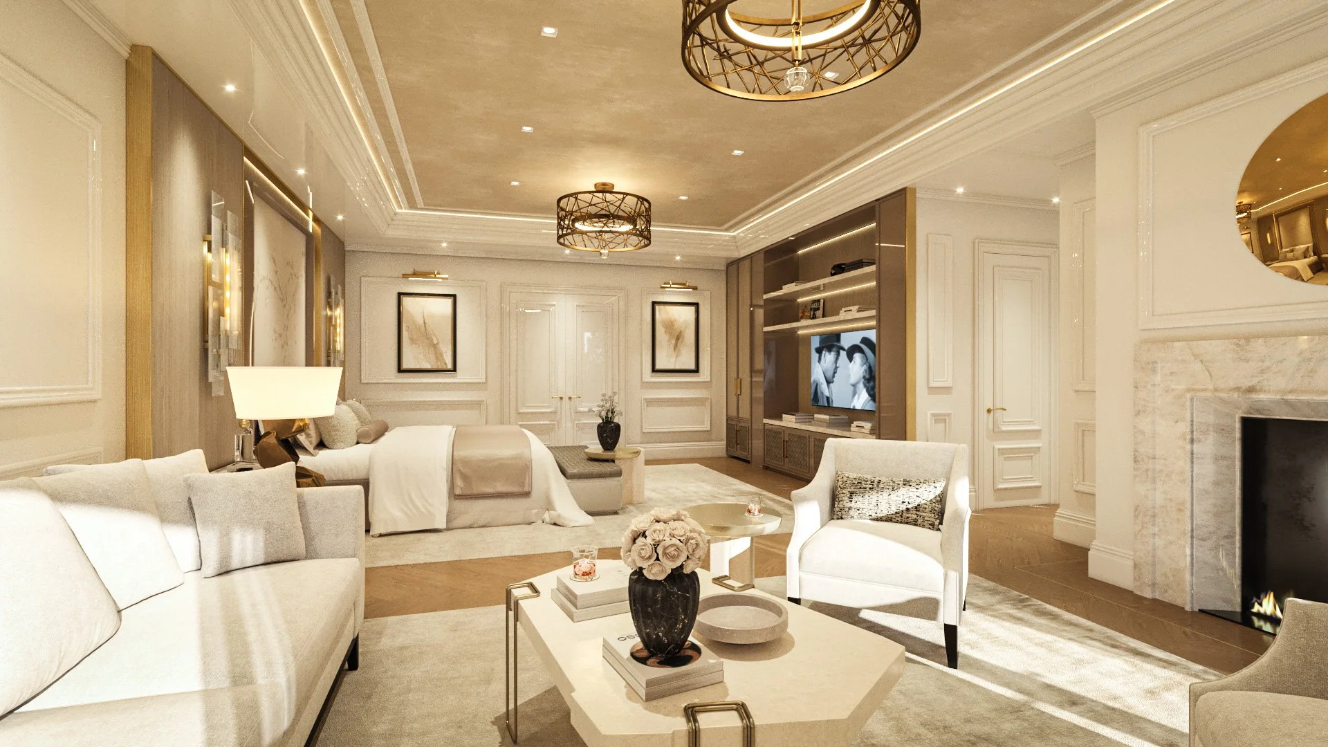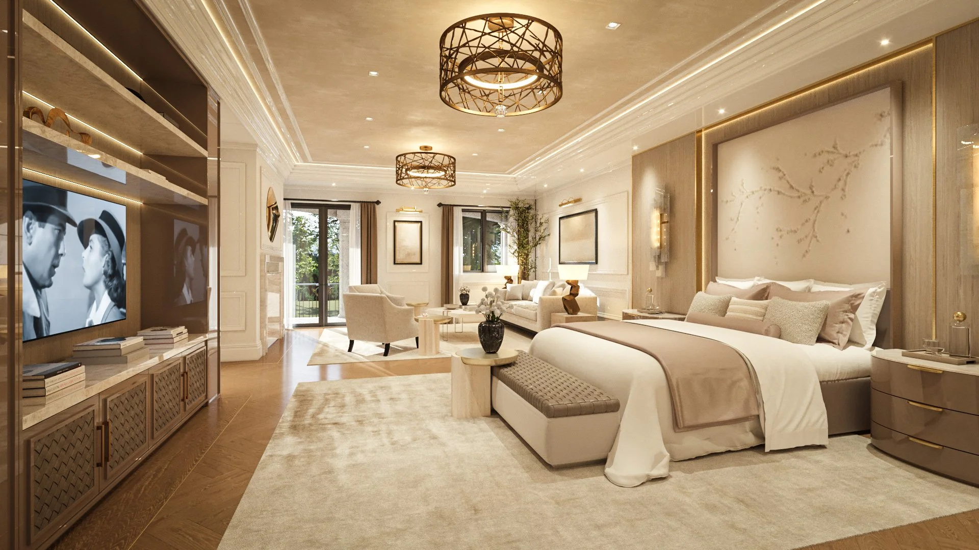 The primary suite is a masterclass in quiet luxury, designed as a sprawling sanctuary where texture and light take center stage. The master bedroom features a sprawling, open-concept layout that effortlessly integrates a private lounge and fireplace, all grounded by warm herringbone wood flooring and plush, silk-touch carpeting. An oversized, custom-illuminated headboard with delicate botanical motifs serves as a soft focal point, while metallic cage chandeliers add a touch of modern sculpture to the expansive tray ceiling.