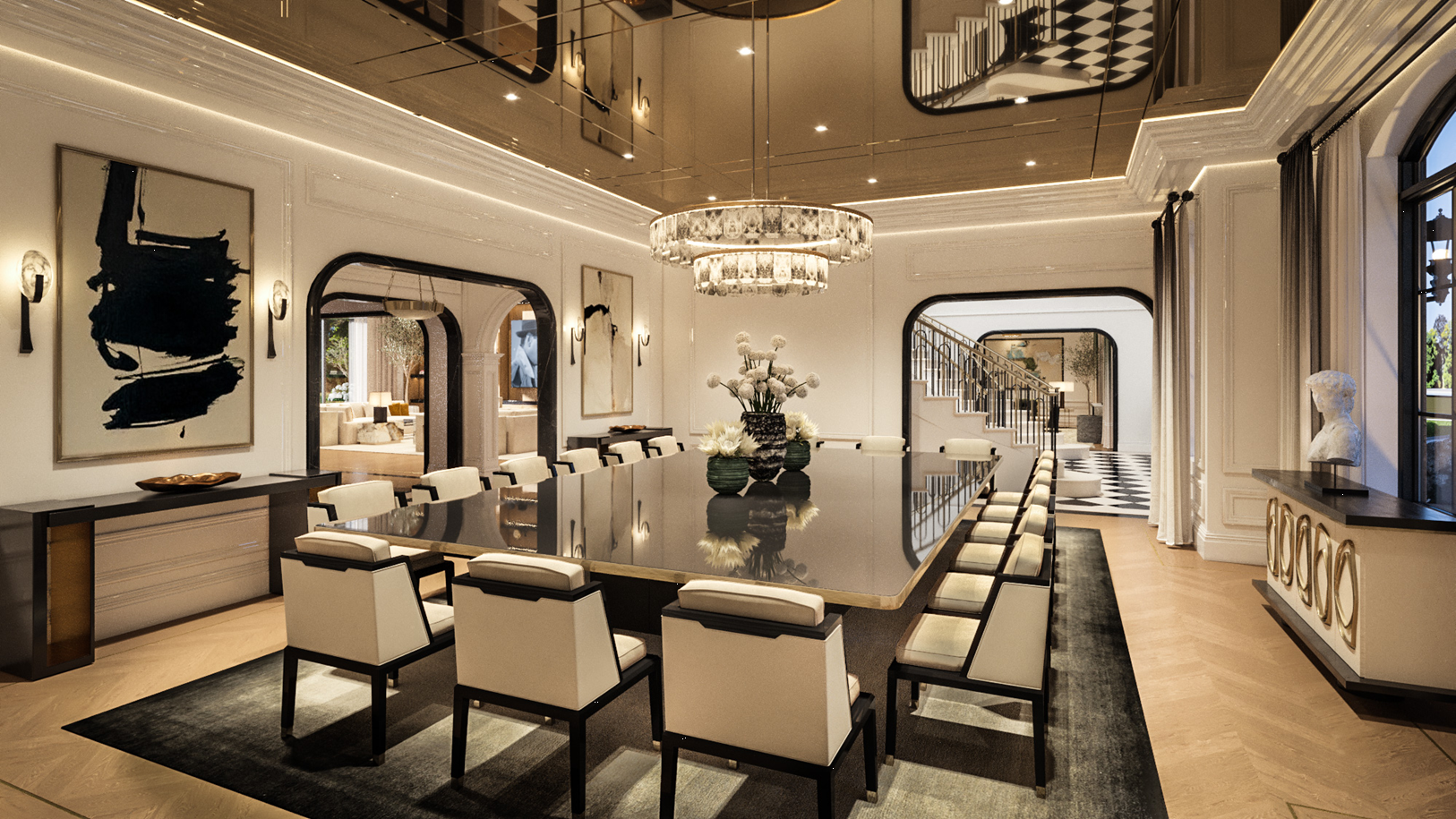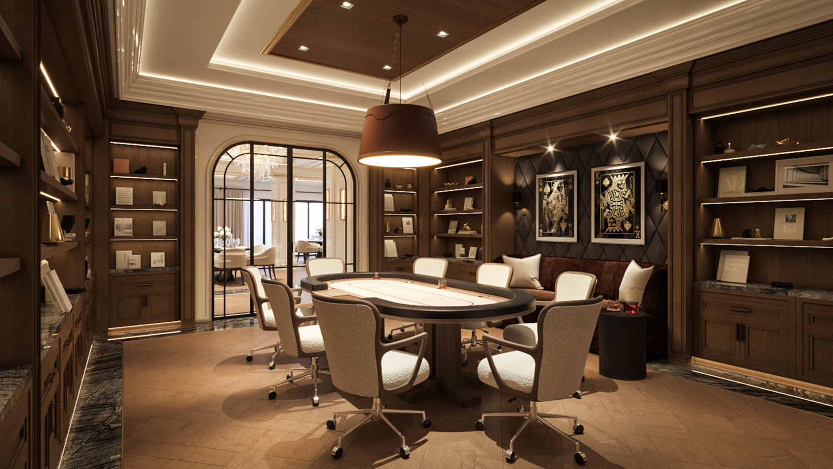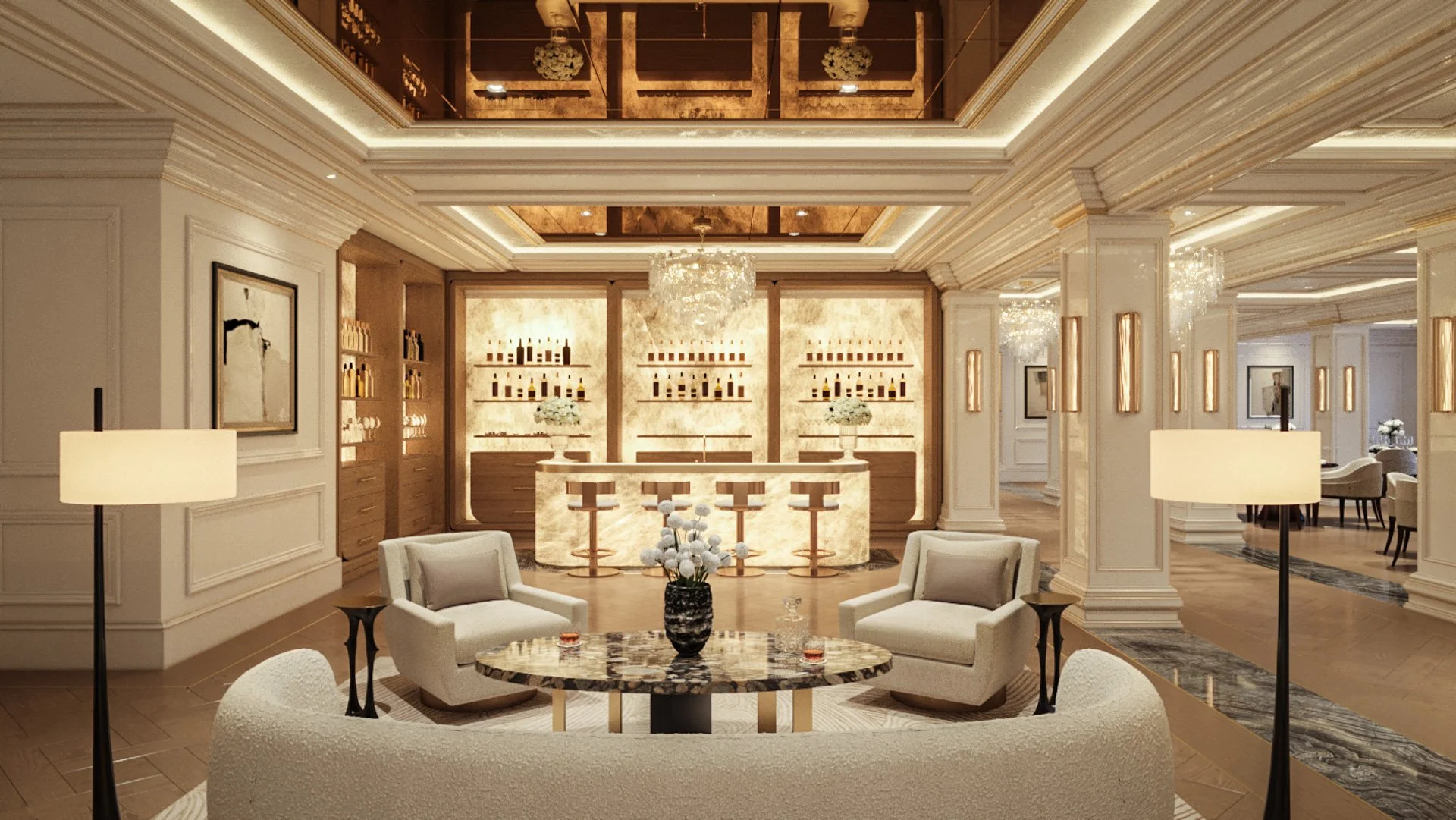 designed as high-drama, immersive environments that blend the exclusivity of a private club with the warmth of a residential sanctuary. These spaces transition from light-filled social hubs to moody, cinematic retreats, utilizing reflective surfaces and bespoke lighting to create a sense of constant movement and energy.